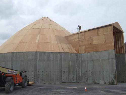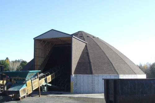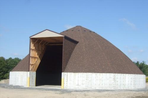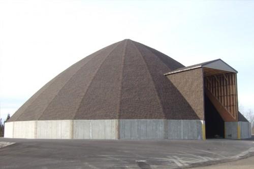 SSCC designs and manufactures and constructs Wood Storage Domes. These domes are the most widely used and most economical building for the permanent storage of sand, salt, and bulk fertilizer. Available in sizes ranging from 50 feet to 150 feet in diameter, and built on cast in place concrete foundations ranging in height from 6'-0 to 20'-0, these domes can store up to 25,000 tonnes of material.